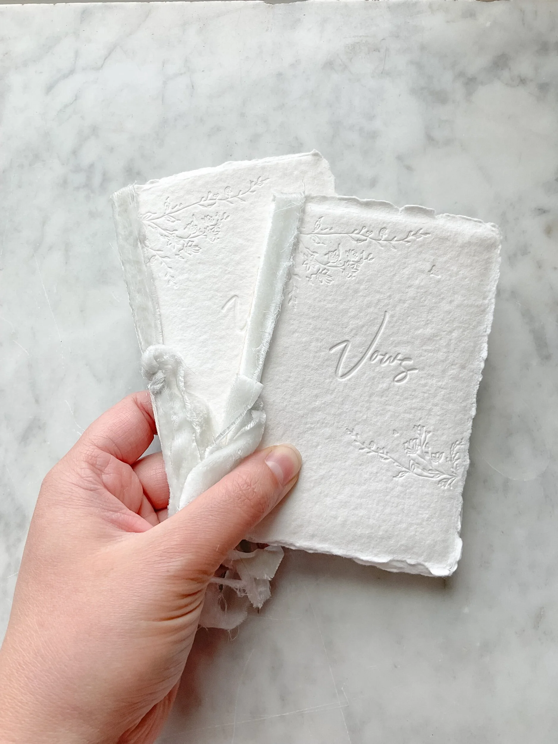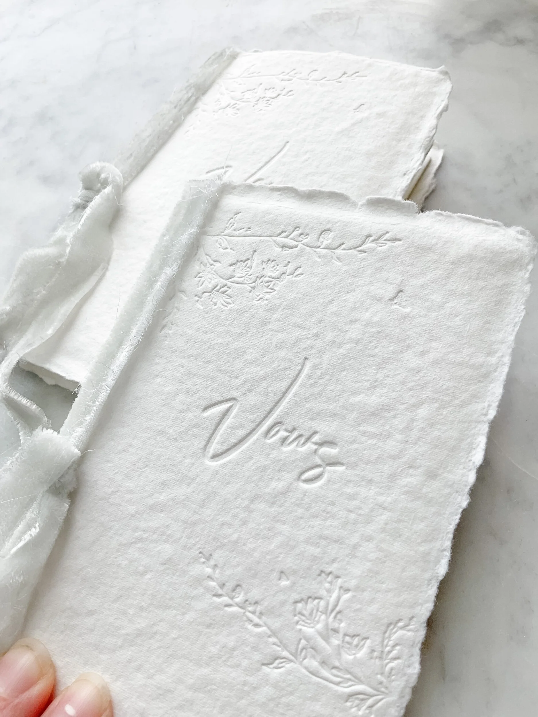 Stationery Letterpress Vow Book Set of two with gold foil printing. $50.00 Letterpress Floral Handmade Paper Note Cards $20.00 Vow Book Set of Two $34.00 Letterpress Floral Scalloped Stationery from $20.00
